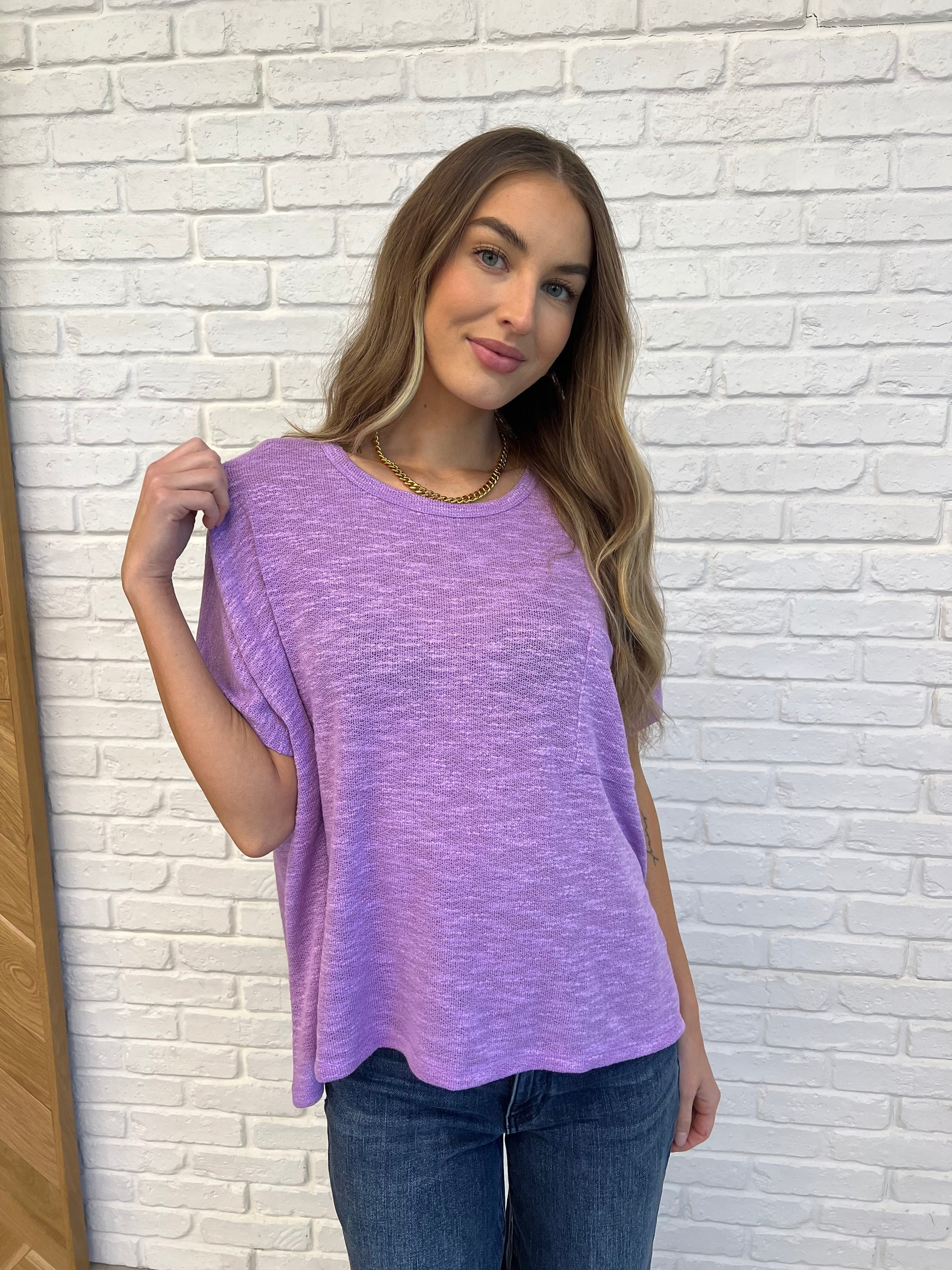 Unleash your flow with this playful and sheer Basically Flowing Dolman Sleeve Top in B Lavender. The oversized fit and dolman sleeves add a touch of whimsy, while the round neckline and front patch pocket add versatile functionality. Made with Hacci material for ultimate comfort!
