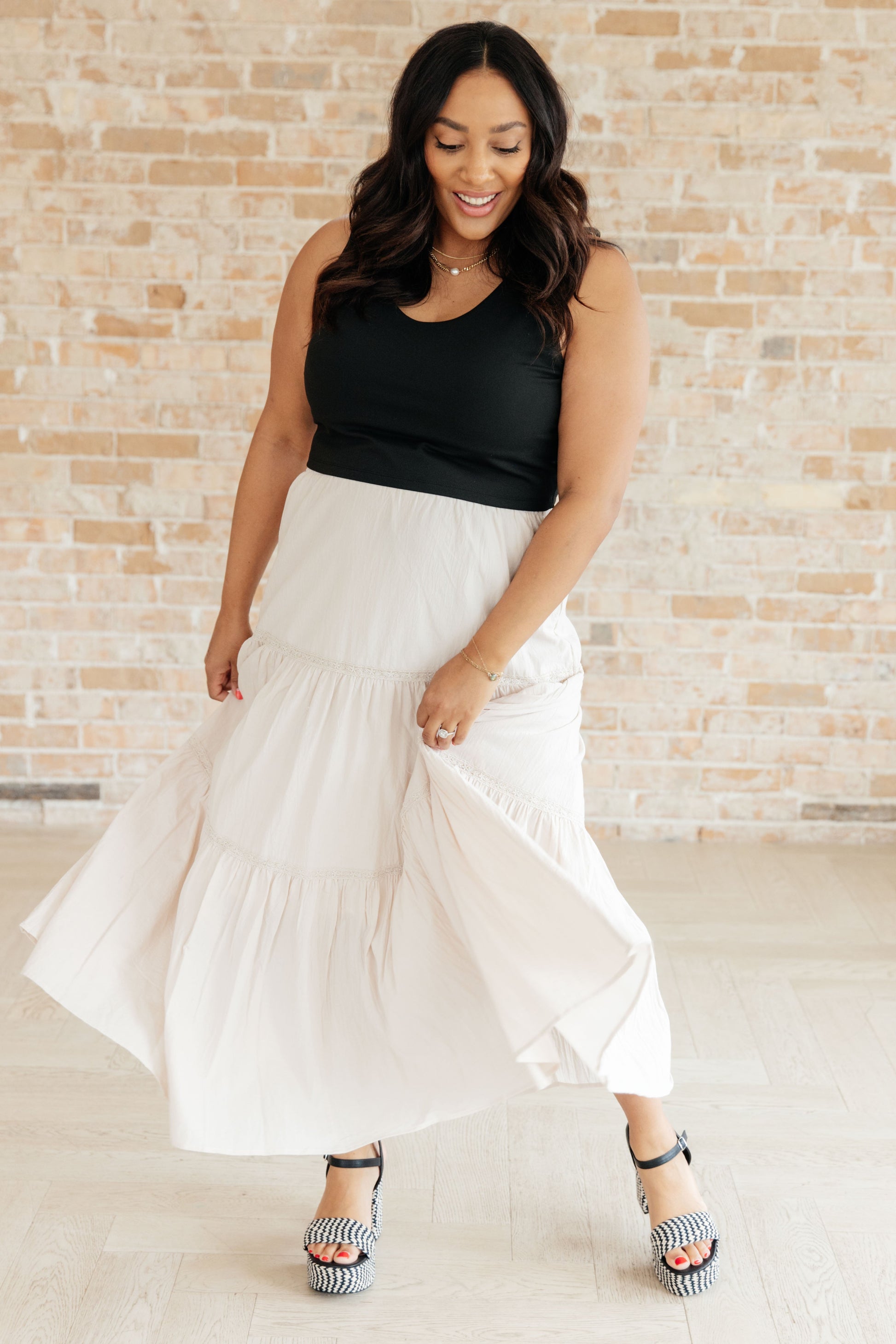 Get ready to flow and dream in our Let It Begin Tiered Maxi Skirt! Lightweight woven fabric and a cased elastic waistband offer a comfortable and flattering fit, while lace accents add a touch of romance. The tiered design creates a flowy and dreamy look, perfect for any occasion.