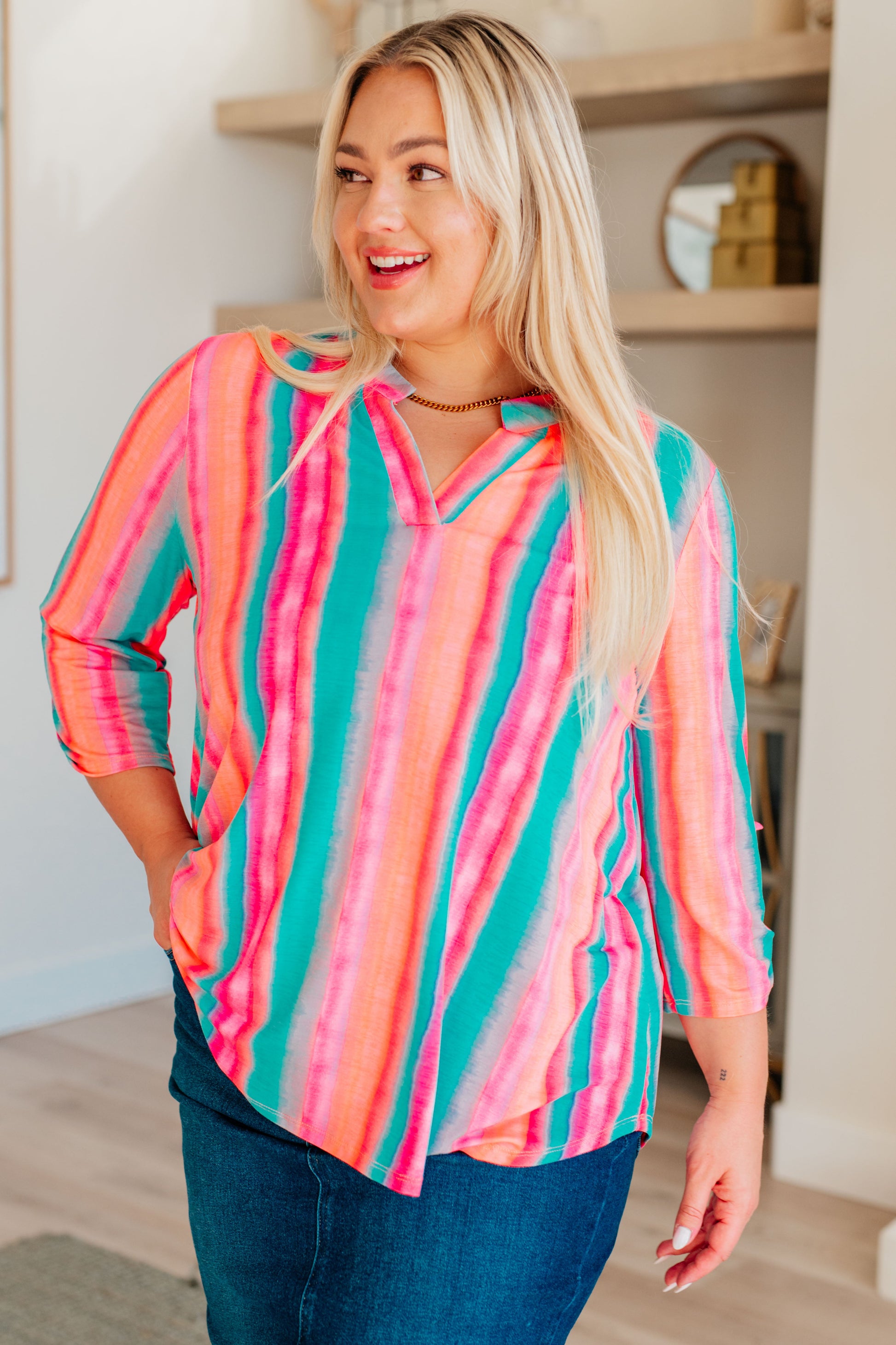 Transform your closet with the Lizzy Top in Ombre Mint Stripe. Made from Bulgari, this top features a gabby neckline and button rolled sleeve tabs for a comfortable, yet eye-turning piece. The 3/4 sleeve and scoop hem add flow to the already stylish piece. Experience comfort and style in one with the Lizzy Top.