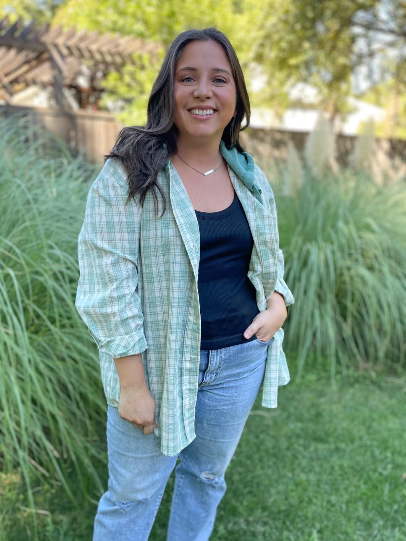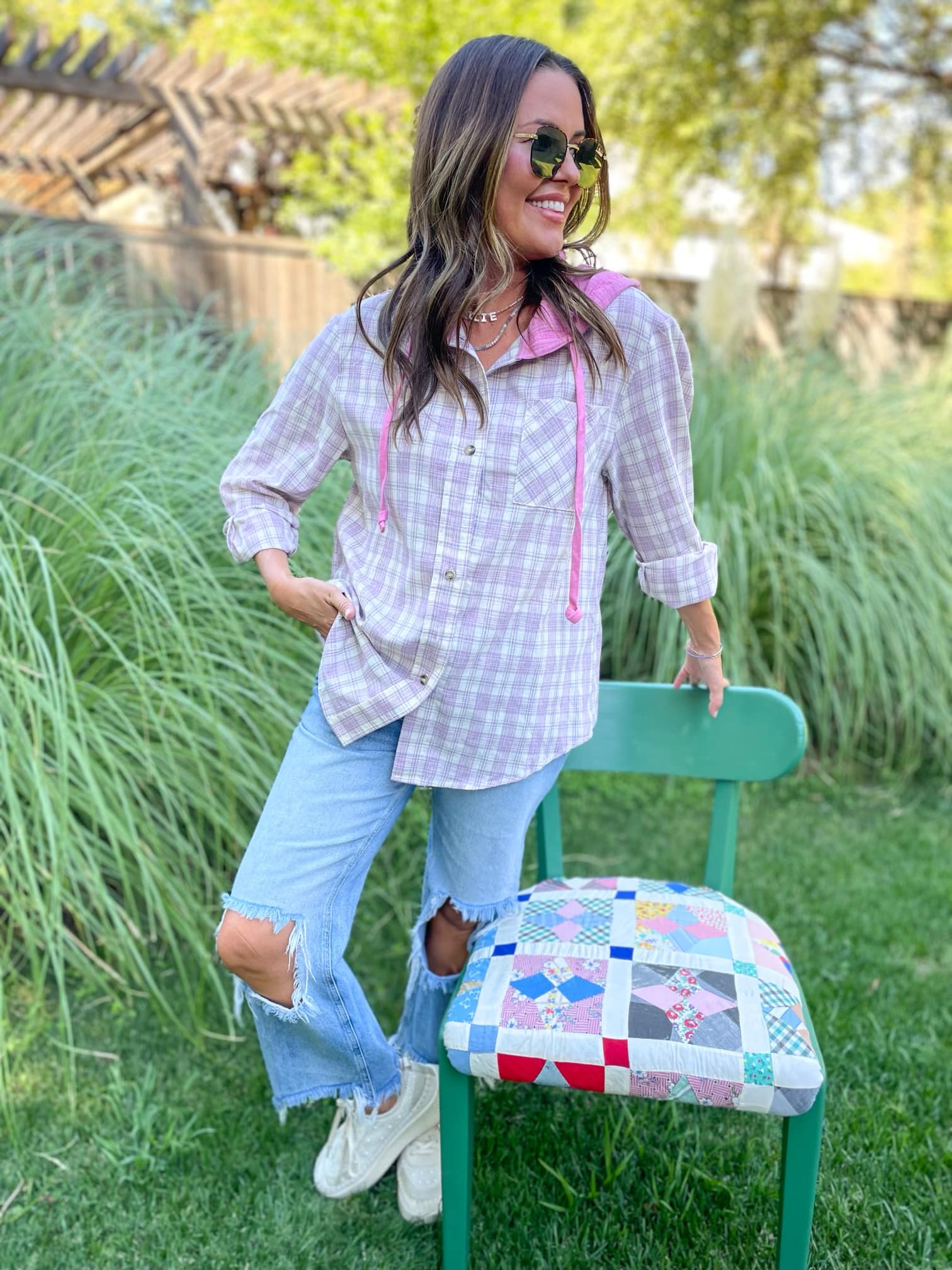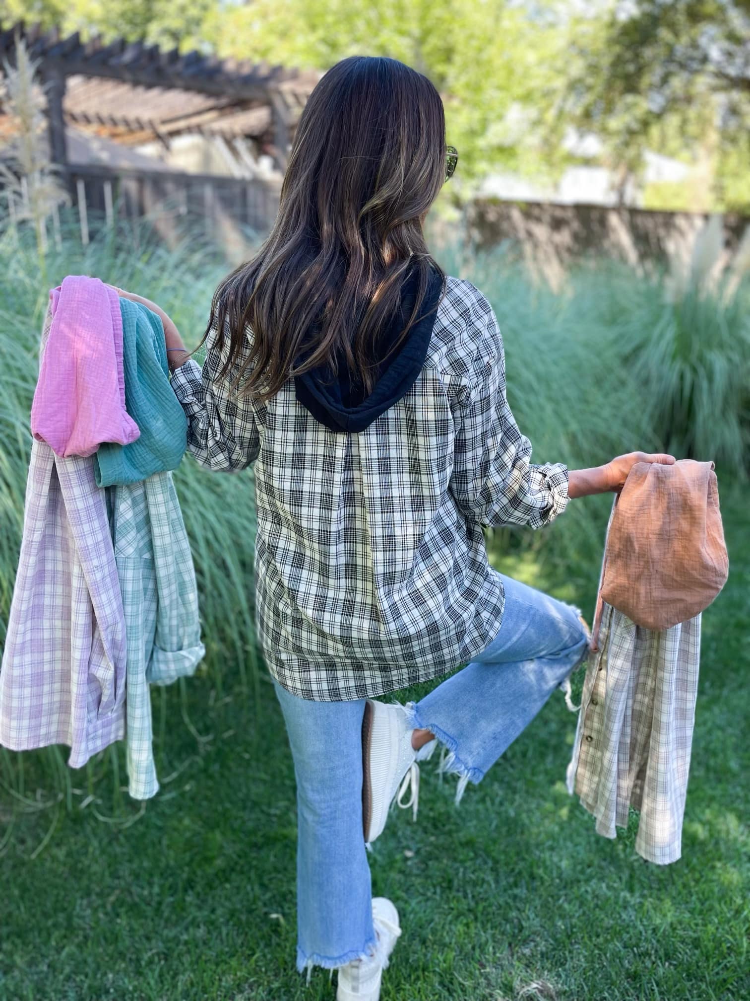 This lightweight hooded button-up is available in four shades of plaid with an accent hood detail. Featuring a chest pocket, functional buttons and hood with drawstring! Wear it buttoned or open as a versatile layering piece for all of your fall activities!
